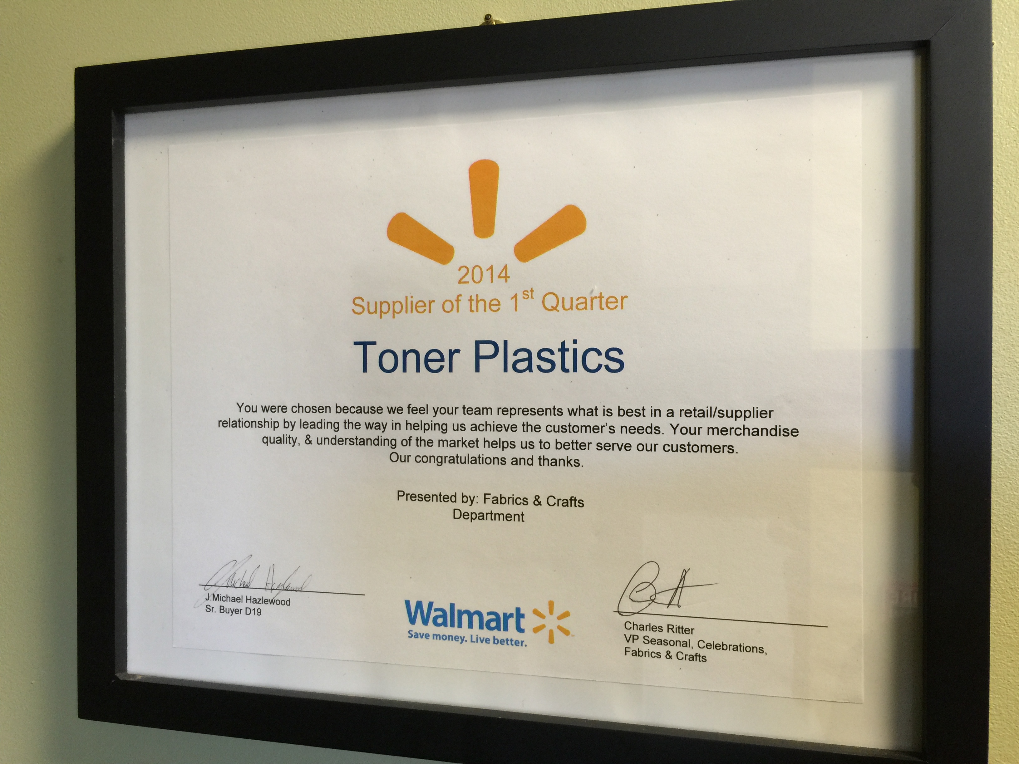 Walmart Awards Toner Plastics Supplier of the Quarter